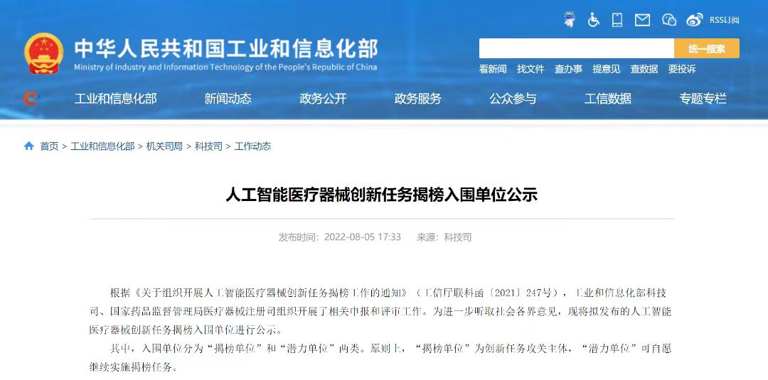 近日,國家工業(yè)和信息化部科技司、國家藥品監(jiān)督管理局醫(yī)療器械注冊司對人工智能醫(yī)療器械創(chuàng)新任務(wù)揭榜入圍單位進(jìn)行公示。