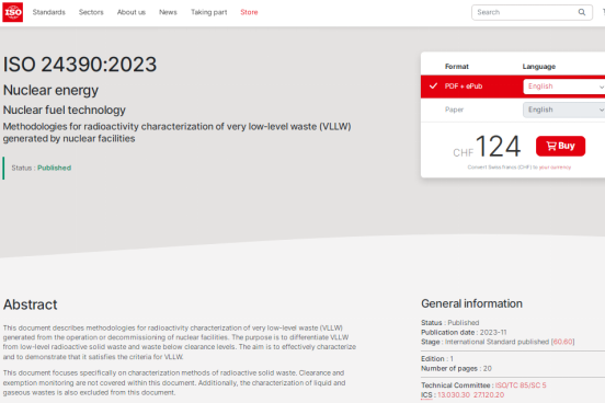 11月30日,由中輻院主導編制的國際標準ISO 24390:2023《核設施產生極低水平放射性廢物放射性表征方法學》正式發布,該標準是由我國在放射性廢物管理領域編制發布的首個ISO國際標準,是中輻院高質量發展和創建”國際一流”院所的又一重要成果,標志著我國在放射性廢物治理領域的國際標準化工作取得重要突破